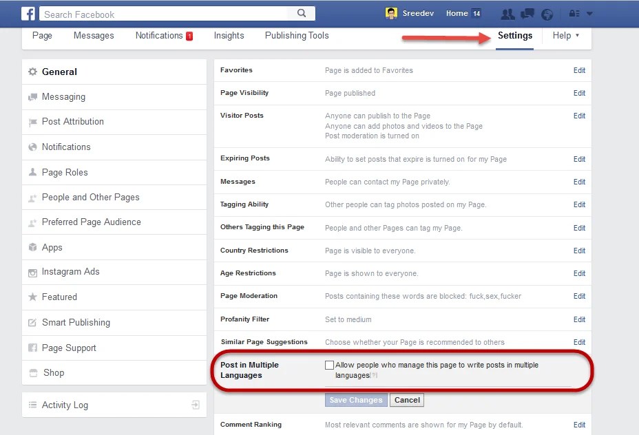 - Check the box, ‘Allow people who manage this page to post in multiple languages’.